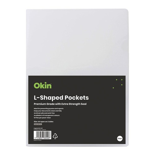 Office Supply Co L Shaped Pockets are archival-safe and acid-free. Ideal for presenting quotes and reports. Designed to open top and side. Made from durable, heavy-duty polypropylene with folded base seal for extra strength. 180 micron thick. Available in 8 translucent colours. Clear colour. A4 size. Pack of 12.